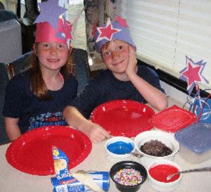 Our Grandkids enjoying 4th of July crafts in the RV Prep Time: 15 min What you need: 2 pieces of red, white, and blue construction paper Instructions: For each Star Wand you will need to cut two each of red, white and blue stars, each a little larger than the first. 1. Cut two red stars using your red construction paper 3-4 inches in size. 2. Cut two white stars slightly larger 4-5 inches. 3. Cut two blue stars slightly larger 5-6 inches. 4. Use your glue stick to glue together the red star to the white star. Then glue the blue star on the back of the red and white star. Now you should have a red, white and blue star all a little larger than the red one stacked on one another. Now allow the glue to dry, then repeat for the second star set. 5. Once the glue has dried on the two sets of stars, place your straw in the middle of the star and tape it to the back of you larger blue star. Then glue the two sets together, and allow to dry. 6. Finish the star wand by taping a 15 inch piece each of red, white, and blue ribbon around the straw. Enjoy! Additional Tips: Independence Day Hat