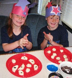 Prep Time: 30 minutes What you need: Scissors Instructions: For each hat you will need to cut two each of red, white and blue stars, each a little larger than the first. Stars 1. Cut two red stars using your red construction paper 3-4 inches in size. 2. Cut two white stars slightly larger 4-5 inches. 3. Cut two blue stars slightly larger 5-6 inches. 4. Use the glue stick to glue together the red star to the white star. Then glue the blue star on the back of the red and white set. Now you should have a red, white and blue star all a little larger than the red one stacked on one another. Allow the glue to dry and place on the hat band. Hat Band 1. To make the headband start with a piece of construction paper, Fold in half length ways and cut in half. Now fold each piece of paper 1 inch length ways and connect the two pieces end to end to make one band. 2. Run a piece of scotch tape on the fold the length of the band for added strength. 3. Place the folded band around the forehead and measure the band to fit, overlapping the ends. 4. Then staple the band to make the base of the hat band. 5.Glue the set of stars to the hat band and Enjoy! Mini-Donut holes (our grandkids call them mini-circle donuts) "R" Kid Chefs" Our Grandkids Ready To Make Mini-Donut Holes For years our family has enjoyed the biscuit donut holes. Our Grandkids like to call them Mini Circle Donuts, and like to add a special surprise in the centers. They are very easy to make. Prep Time: 15 min Makes 20 Servings Supplies: Small Frying Pan, 2 cups of Cooking Oil, spoon with slots so the oil can drain, knife, fork, small plastic container with lid, a couple of paper towels or napkins, and a can of refrigerated biscuits (any kind will do, I use the small cans, they cook faster). For the powder coatings on the mini donuts you will need 1 ½ cups of confectioners’ powdered sugar and for the Cinnamon coating you will need 1 cup granulated sugar and 1 heaping teaspoon of cinnamon. For the surprise center fillings you will need chocolate chips, M&Ms, raisins. etc. For the holiday frosting you will need red food coloring, blue food coloring and candy sprinkles. Suggested Coatings (pick one or two or use them all) Powdered Sugar Coating: In a small plastic container with lid (4 ½ X 6 ½ x3) add confectioners powdered sugar, set aside.