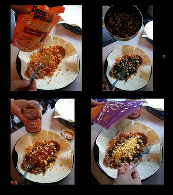 Add your rice, black bean/corn mix, salsa, onion, cheese & "meat".